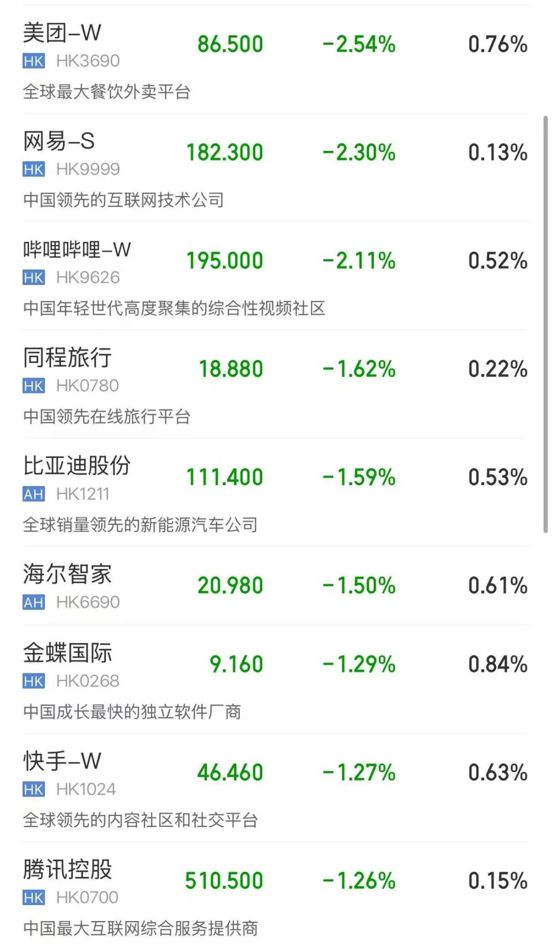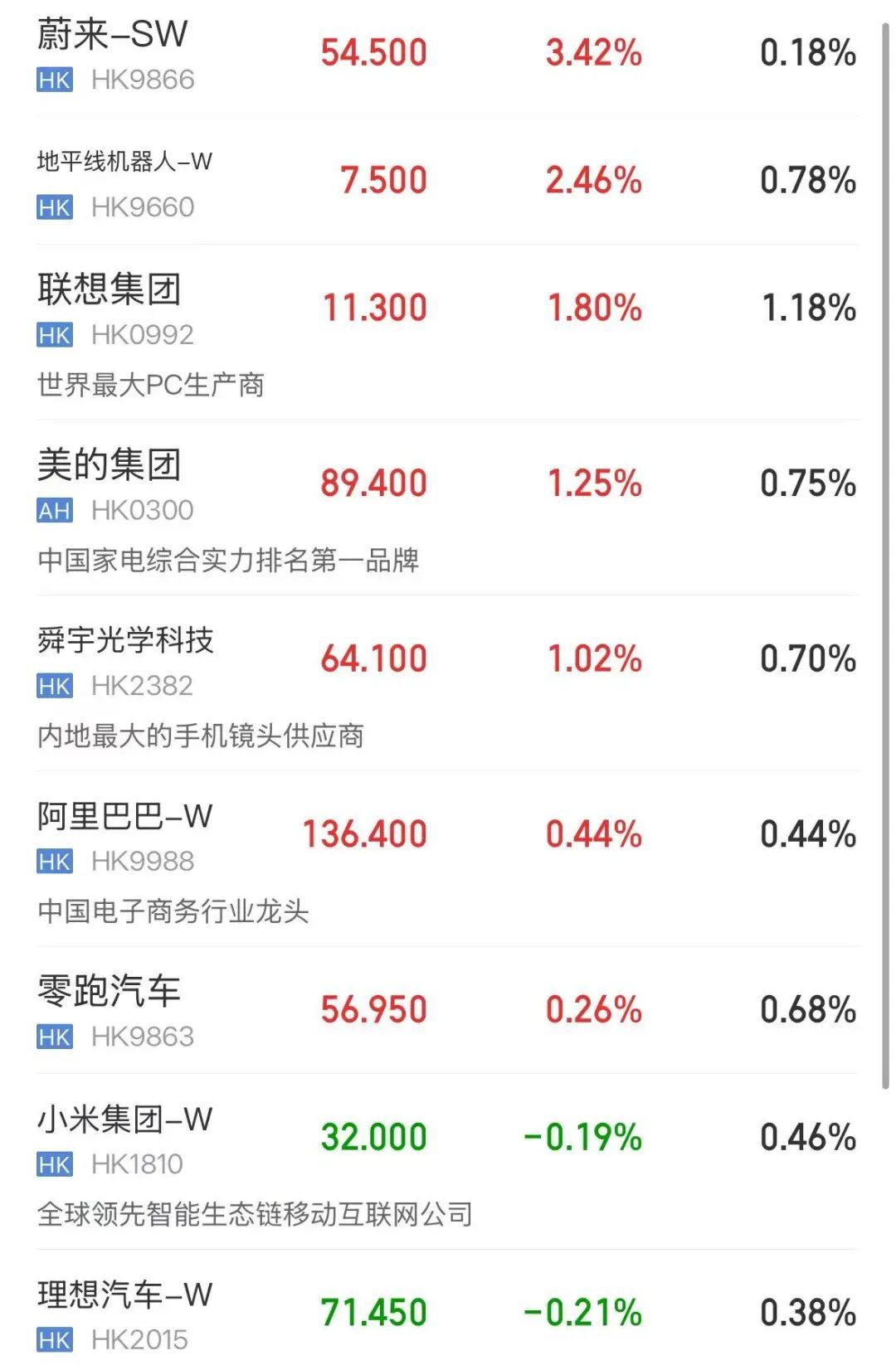 科网股涨跌不一,蔚来涨超3%,联思、好意思的、阿里巴巴、零跑高涨,好意思团、网易、腾讯控股、快部属跌。